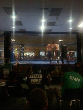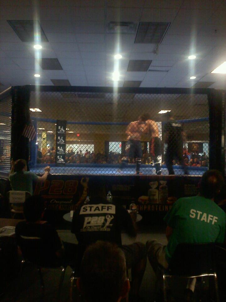 It’s hard to tell, but we were in the Family/ Staff area and on the other side of the ring there were about 200+ people watching the matches. I admit to being fascinated with MMA / UFC since seeing Warrior (if you haven’t seen it, rent it. Now. Hand’s down the best movie we saw in 2011) but I was surprised how into it we got. I mean- it’s brutal. One guy got a compound fracture in his foot- it was gross. And, again, fascinating.
