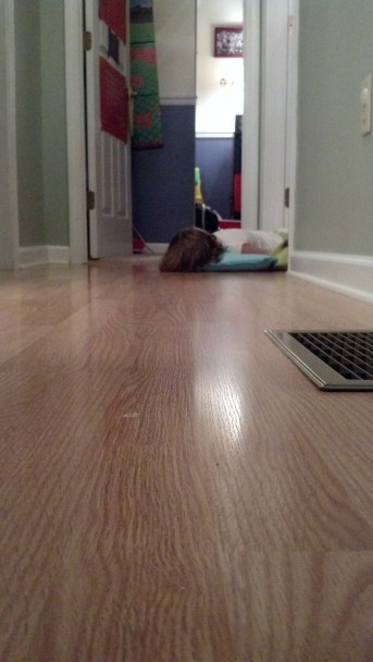 Despite having a very comfortable bed and pillow, the child insists on sleep half in her room and half out- laying on the wood floors using a very small decorative pillow. I don’t understand. But because she sleeps that way, I don’t fight her on it either. Odd, odd, odd.